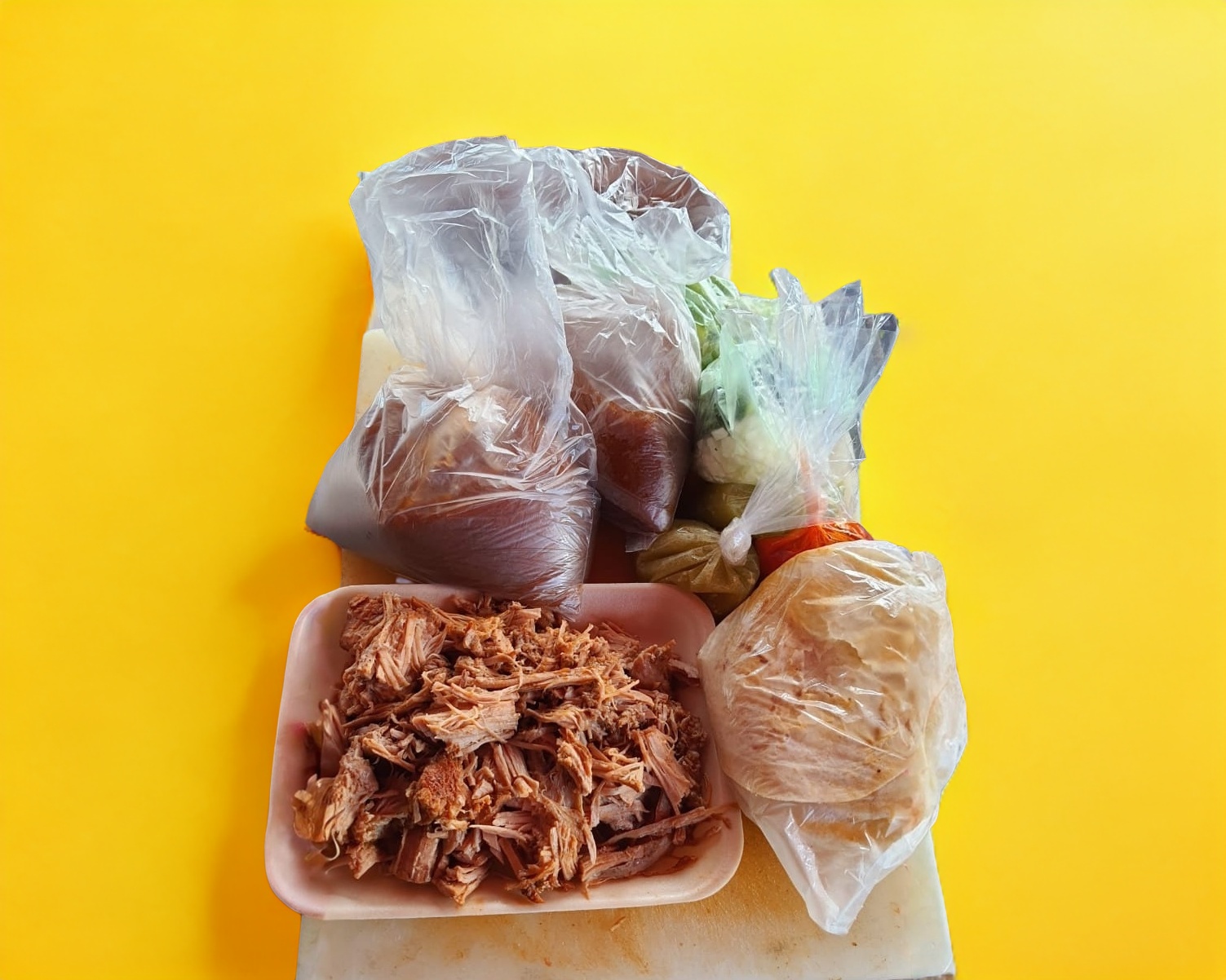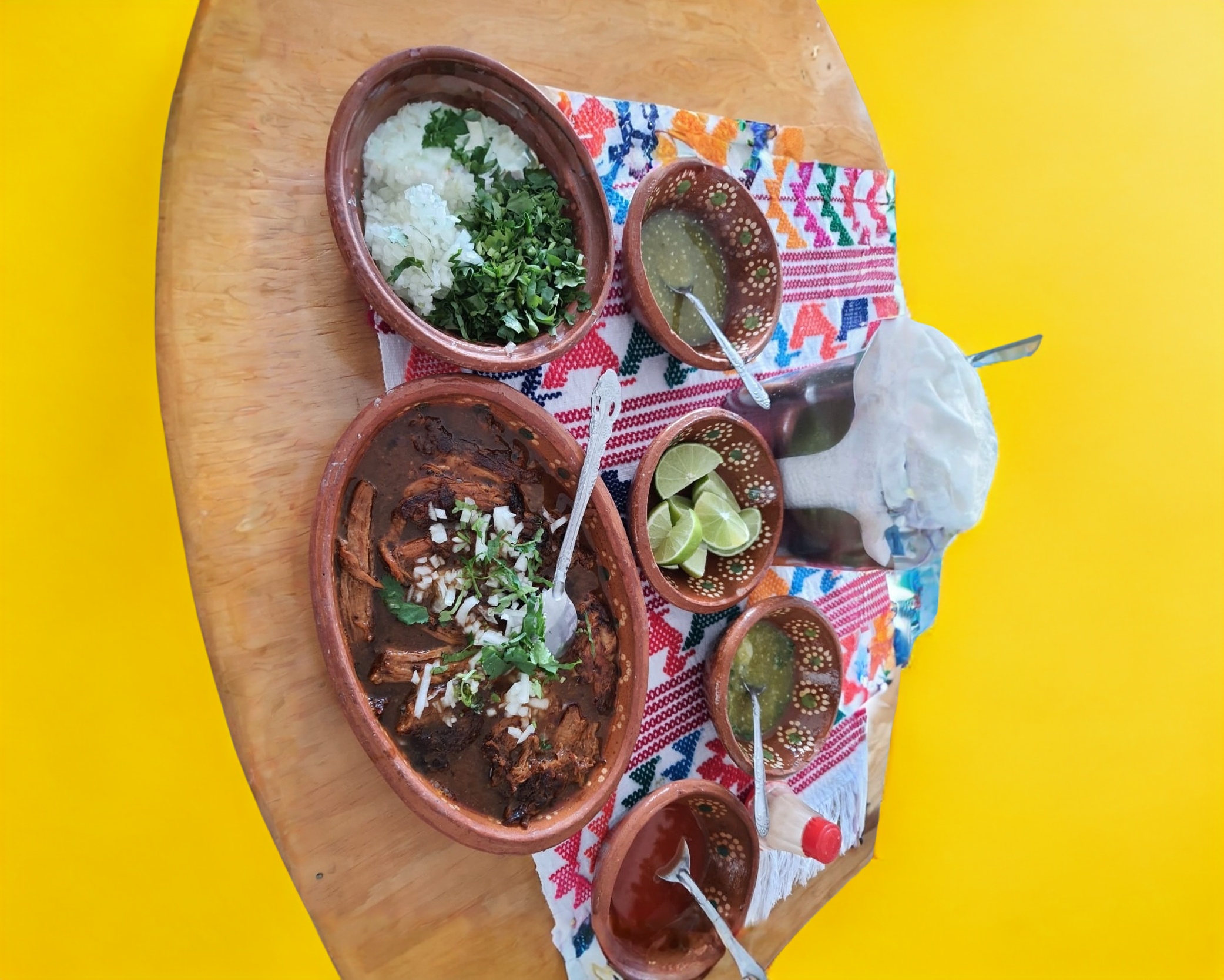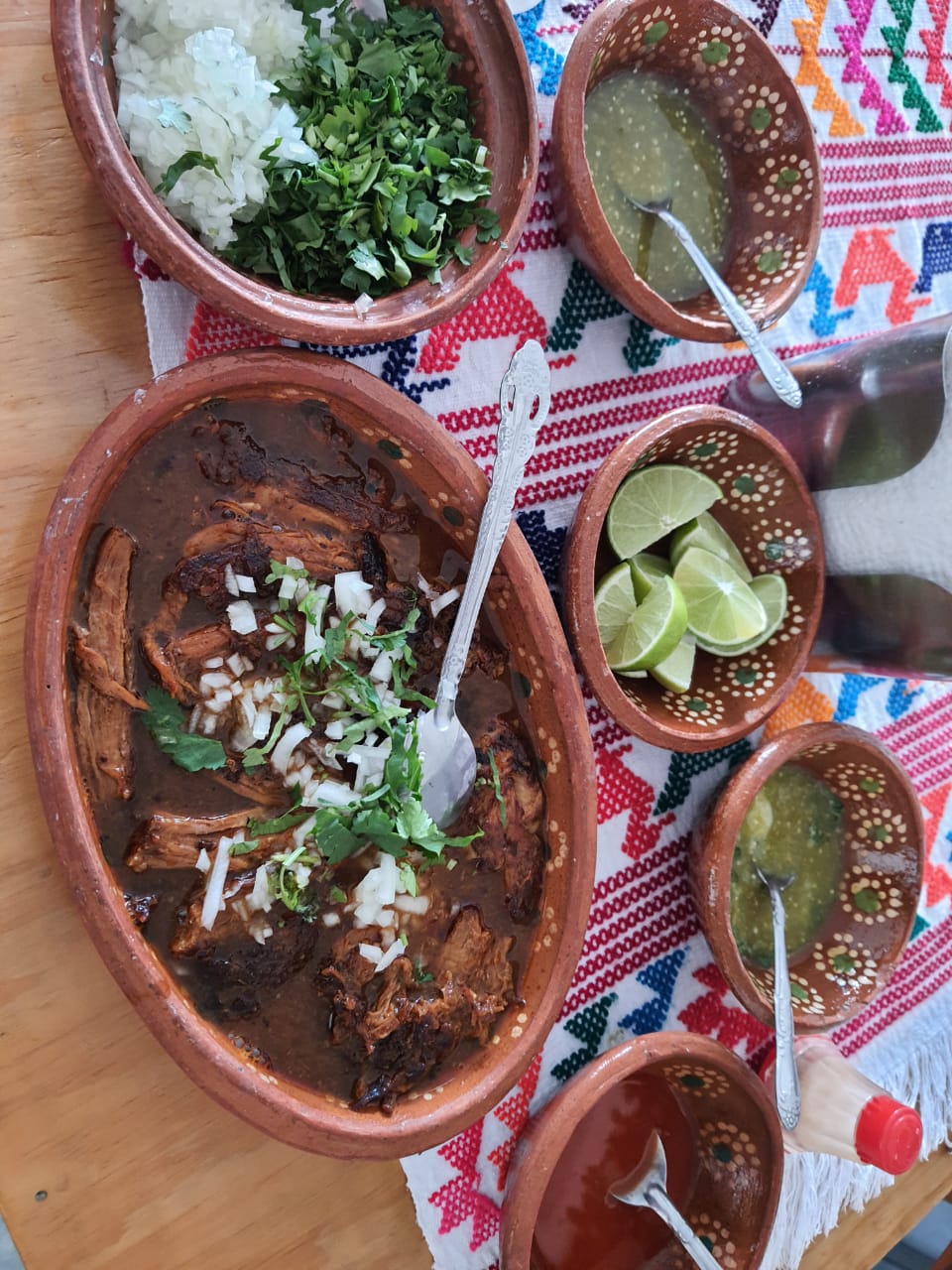 Kilo de Birria de res acompañado de tortillas consome, salsas y verdura.