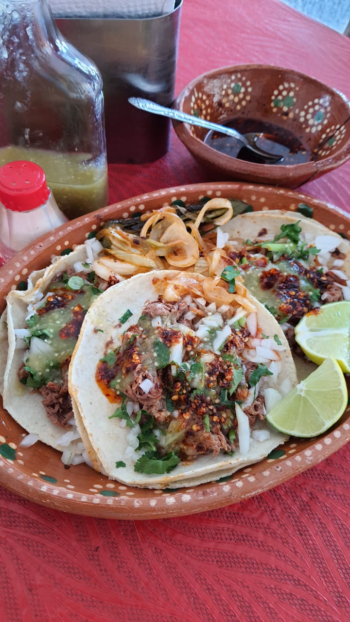 Doble tortilla de maíz, carne de birria, cebolla y cilantro, salsas, cuando se acaba el cilantro no se envía