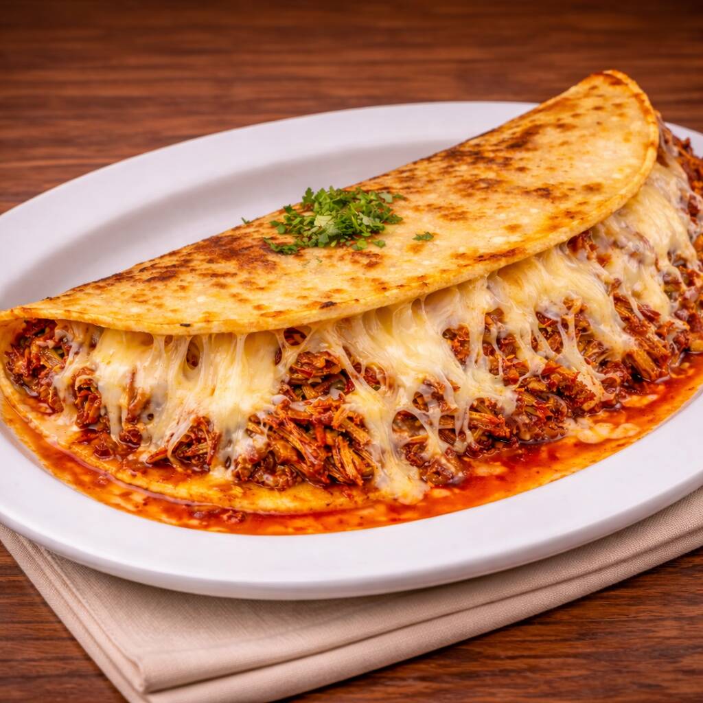 Tortilla de masa grande, doradita al comal, rellena con birria jugosa y bien sazonada, cubierta con queso derretido que estira en cada mordida 🤤🔥 Bañada con ese toque de consomé que la hace aún más irresistible, combinando lo crujiente por fuera con lo suave y jugoso por dentro 💥 🥢 Cada bocado es puro sabor, queso fundido y birria que se deshace… 💎 Una gringa que no pasa desapercibida