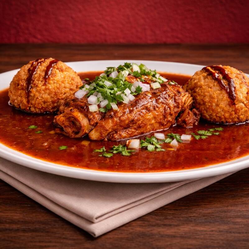 Chamorro de birria suave y jugoso, cocido lentamente hasta quedar tan tierno que se deshace al tocarlo 🤤🔥 Acompañado de su consomé bien caldito y lleno de sabor, con cebolla y cilantro fresco que realzan cada bocado 🌿🥣 Coronado con bolitas de arroz estilo samurai, doraditas por fuera y suaves por dentro, bañadas con un toque especial que lo vuelve único 🍚💥 🥢 Una combinación poderosa,