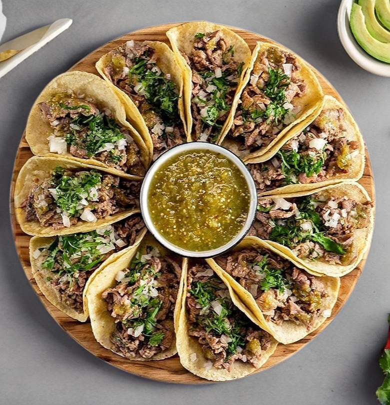 2 Tortillas hechas a mano, birria de res, verduras, salsas, cebollita guisada y chile toreado.