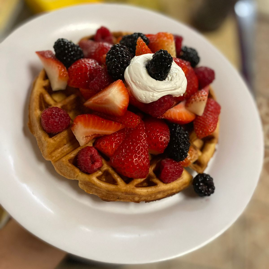 Orden de molletes dulces de mantequilla, con topping a elegir, fruta del día y cereales, postre del día, y refresco a elegir.