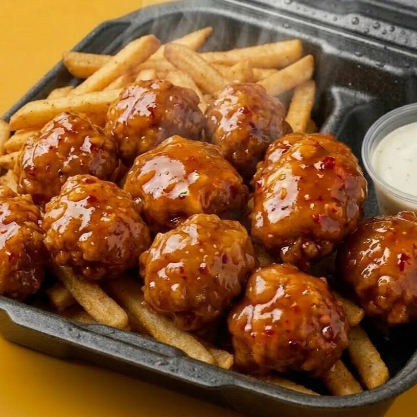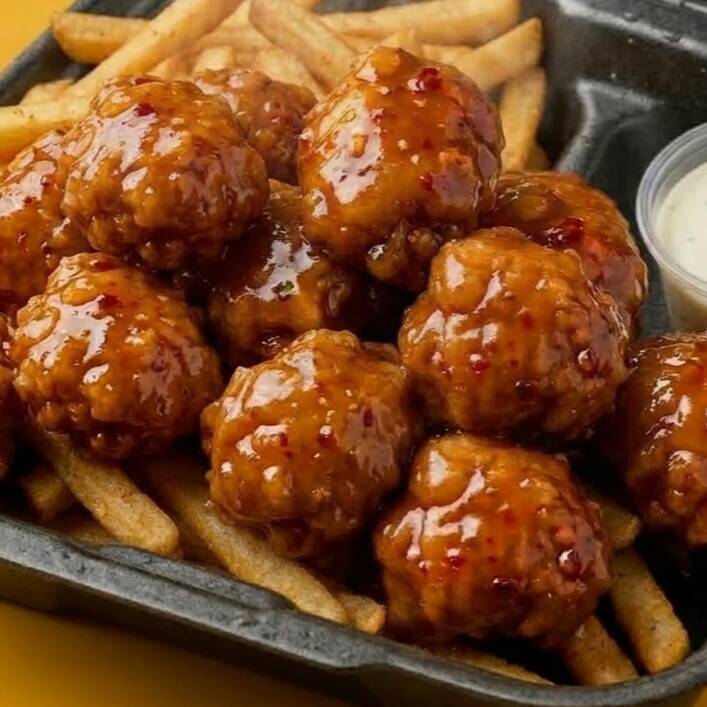 10 boneless crujientes bañados en tu salsa favorita acompañados de 300g de papas fritas doradas. Incluye ranch.