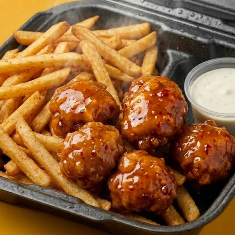 5 boneless crujientes bañados en tu salsa favorita acompañados de 150g papas fritas doradas. Incluye ranch.