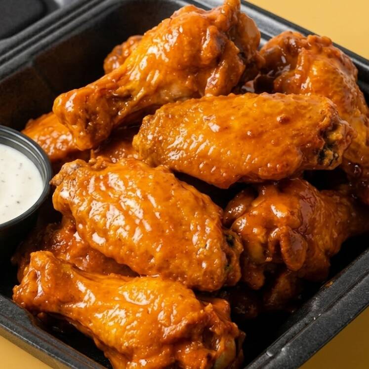 Alitas de pollo crujientes bañadas en tu salsa favorita. Incluye aderezo ranch