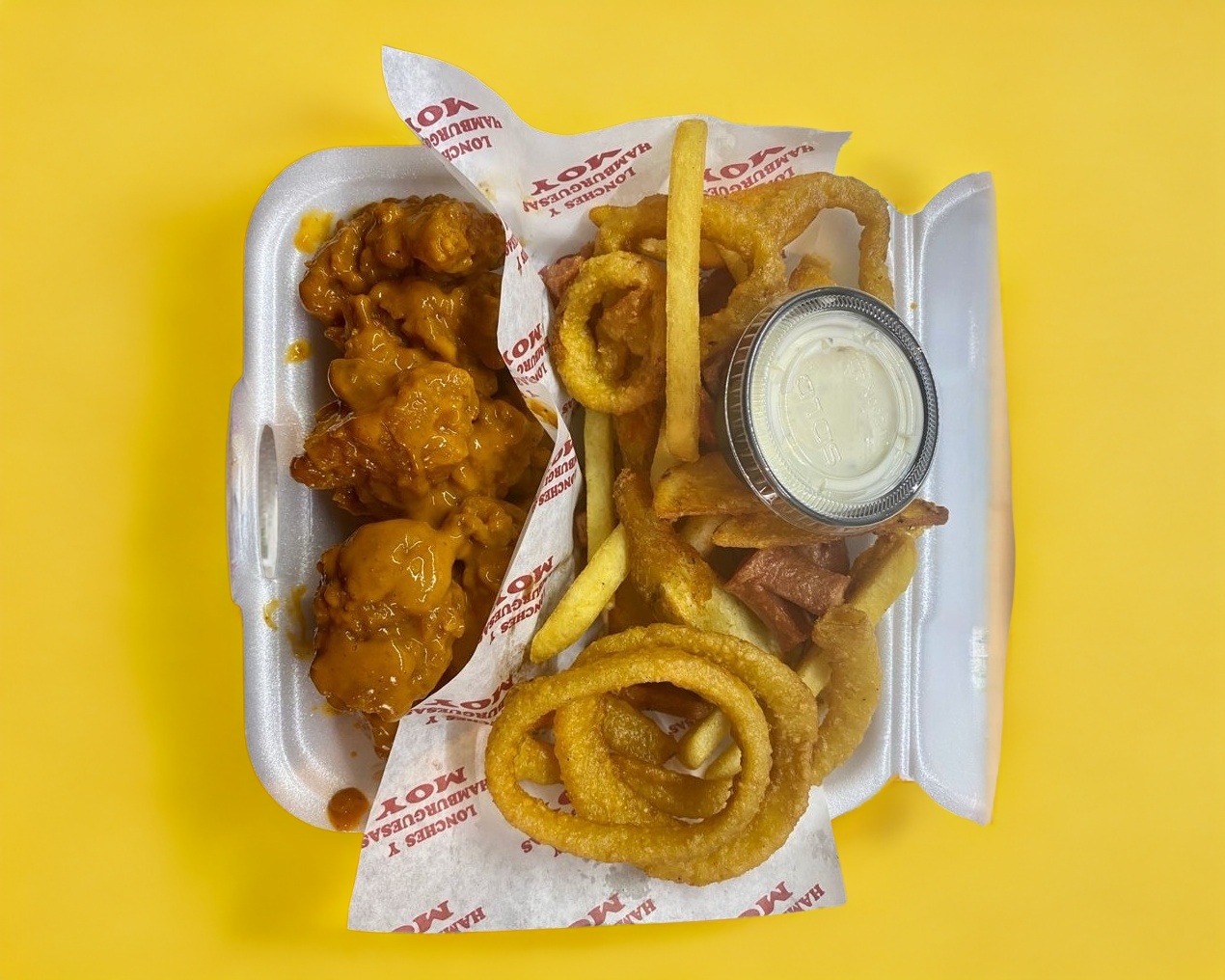 1/2 boneless + papas francesa y papas gajo + aros de cebolla + Salchipulpos + aderezos