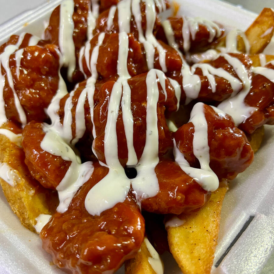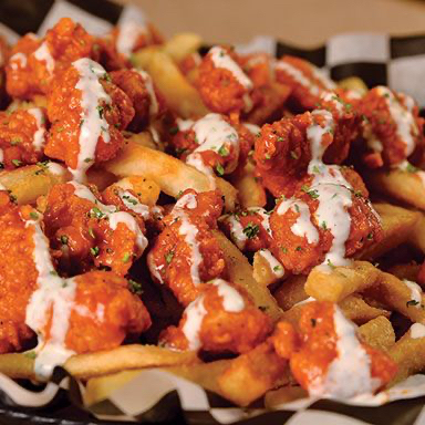 400g de papas doradas y crujientes cubiertas con 500g de Boneless todo bañadito en tu salsa favorita y rematadas encima con tu aderezo favorito (peso en crudo)
