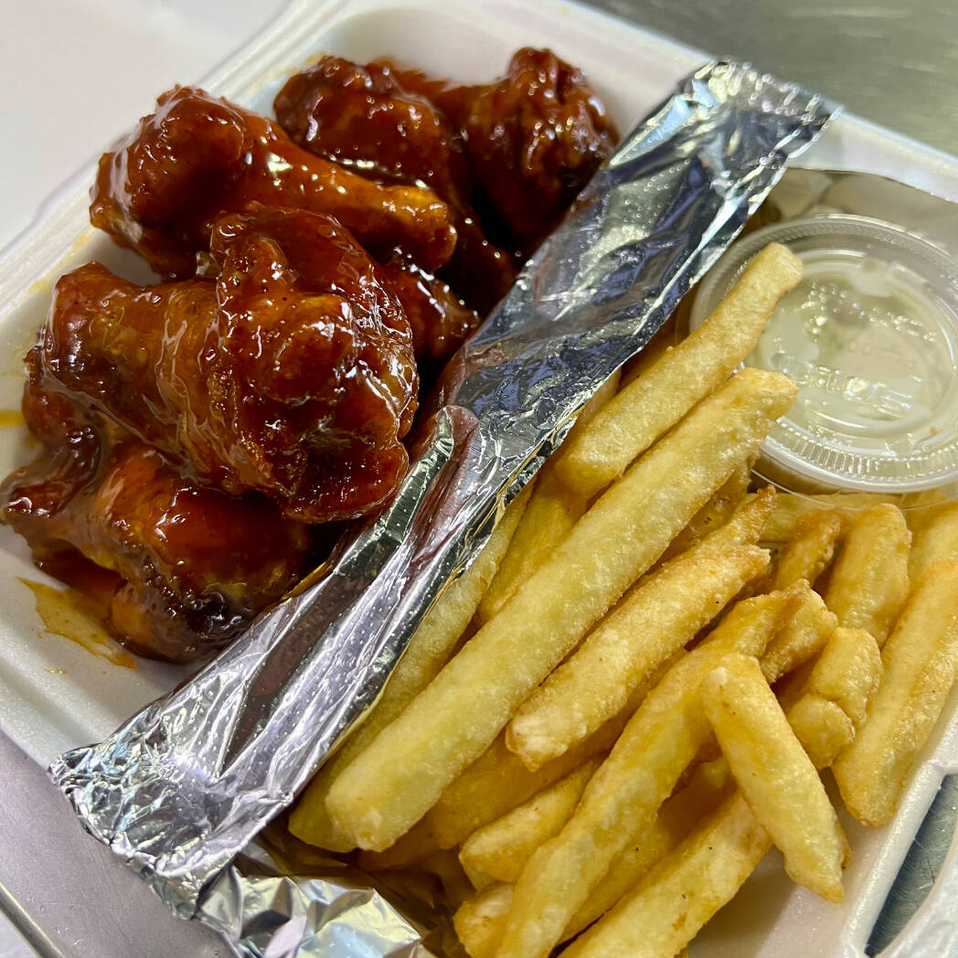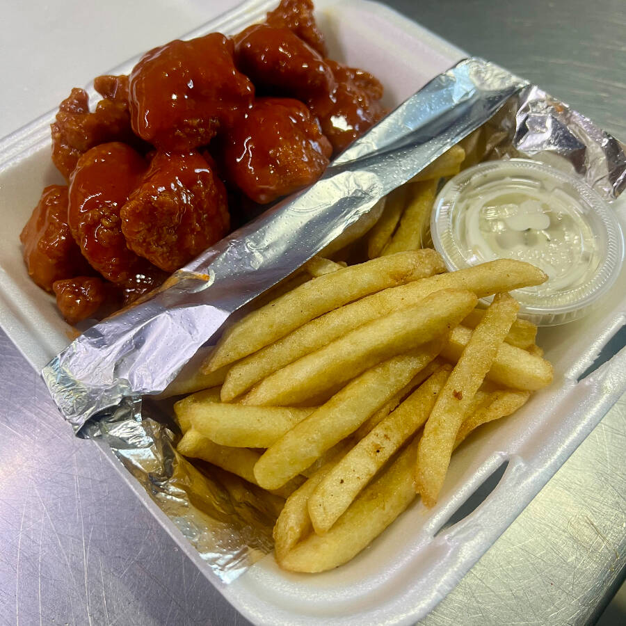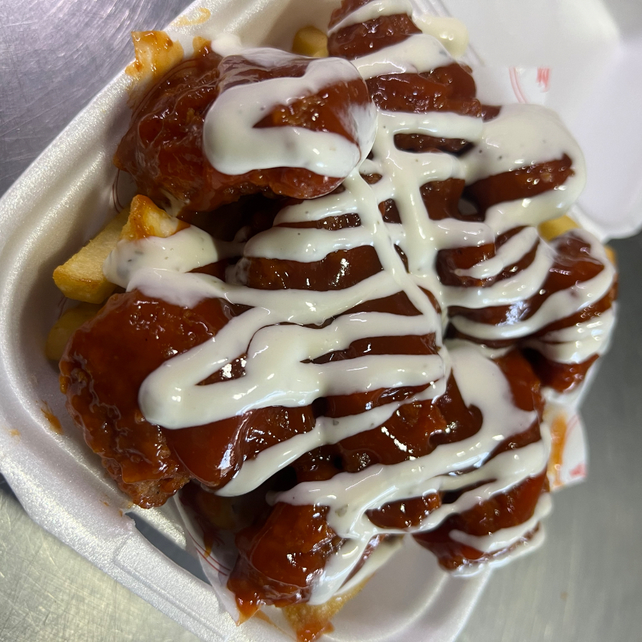 200 g de papas doradas y crujientes cubiertas con 250g de Boneless todo bañadito en tu salsa favorita y rematadas encima con tu aderezo favorito (peso en crudo