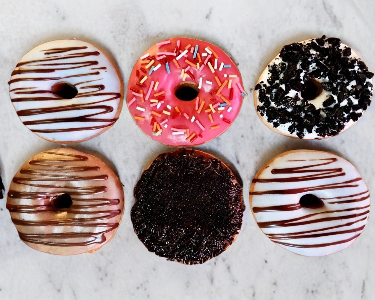 Caja con 6 Donas combinadas forma de rosca de reyes con chocolate blanco y obscuro, ate y cereza