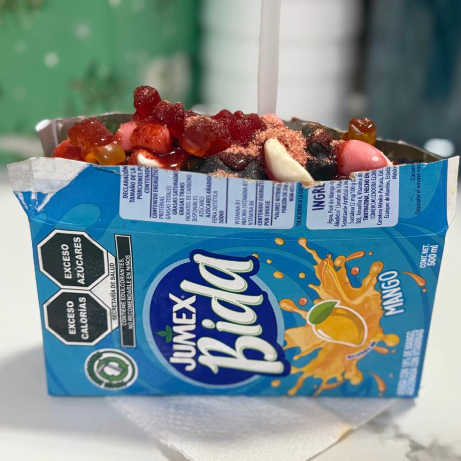 jugo con gomitas , chile y chamoy