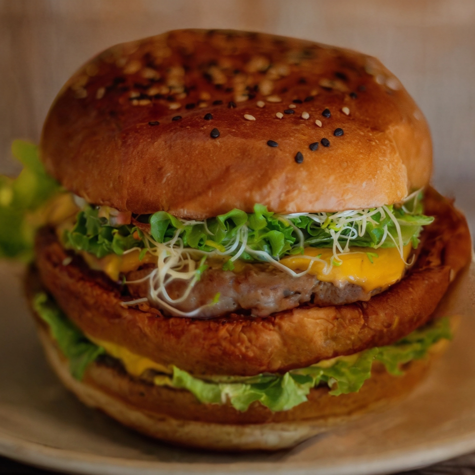 Hamburguesa de res con queso amarillo a la plancha con pan artesanal, acompañado de lechuga, germen de alfalfa, cebolla y aguacate, aderezo a elección.