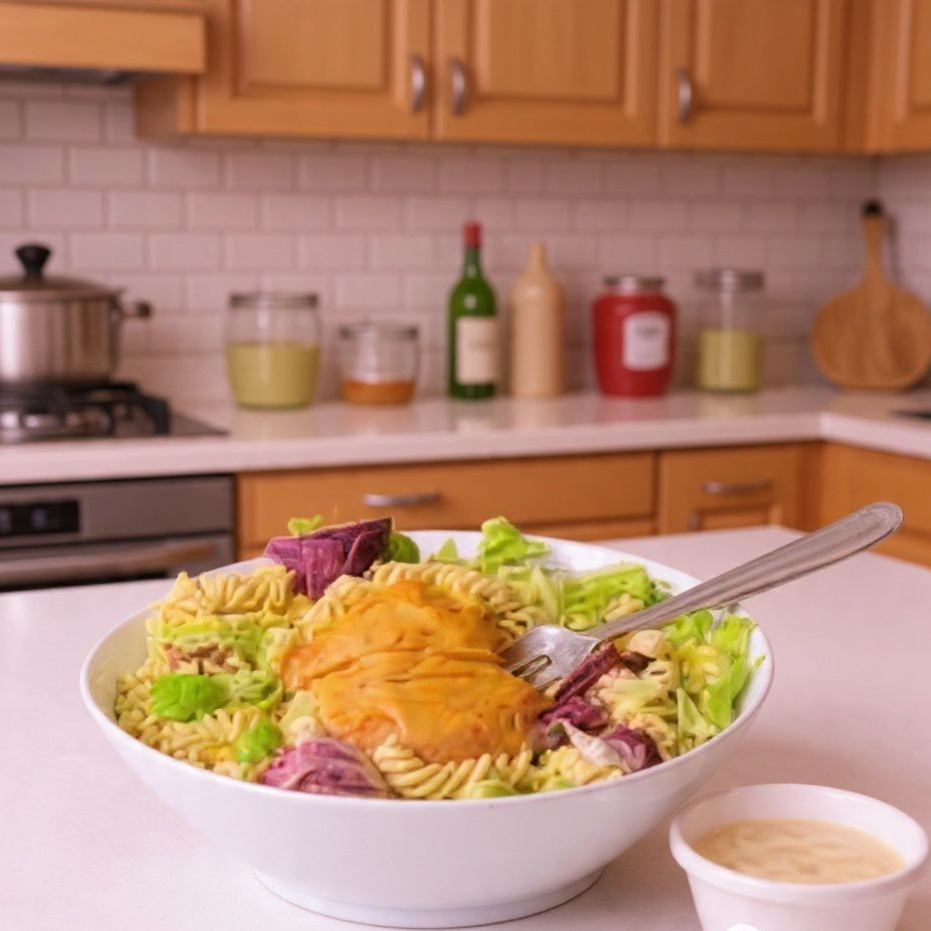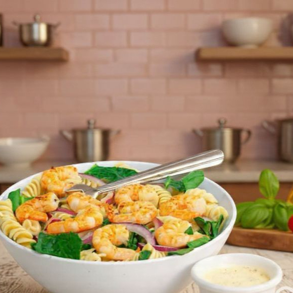 Pasta fusilli, camarón, espinacas, cebolla morada y aderezo.