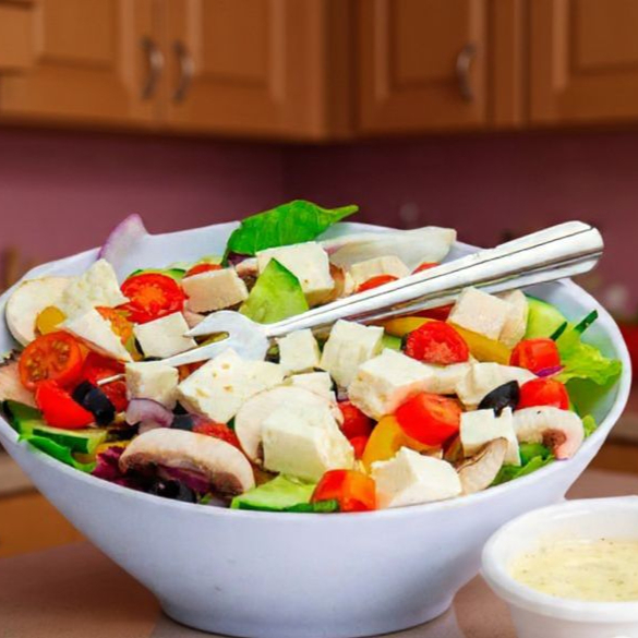 Panela, pimiento morrón, aceituna negra, cebolla morada, pepino, jitomate cherry y aderezo.