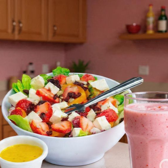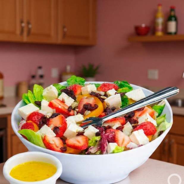 Fresas, durazno en almíbar, panela, arándanos, semillas de girasol, lechugas mixtas y aderezo.