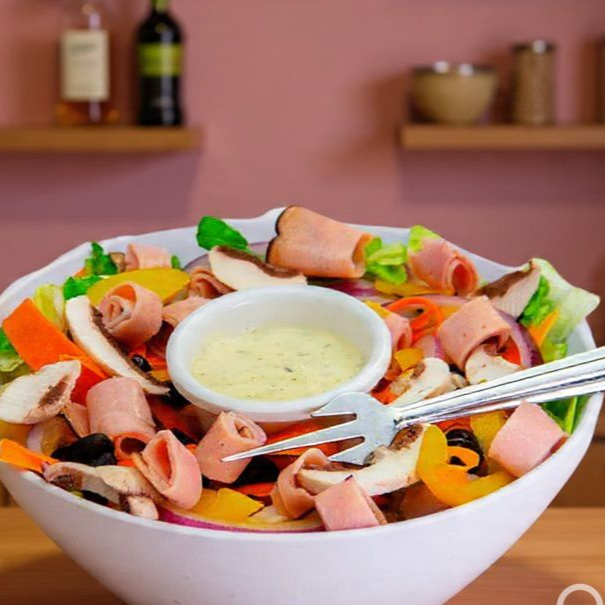 Con jamón selva negra, aceituna negra, zanahoria, cebolla morada, champiñones, pimiento morrón y aderezo.