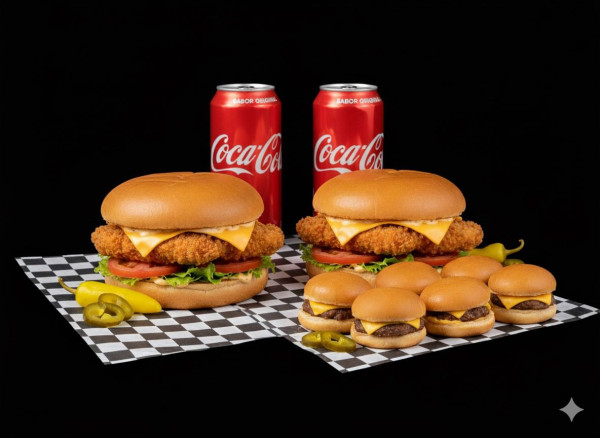 Dos hamburguesas con pollo empanizado 180 g en pan brioche con queso amarillo y lechuga fresca. Incluye 2 refrescos 355 ml y 8 mini hamburguesas de res con queso fundido. Acompañamiento: 4 pepinillos, 4 nachos, 1 chile güero por hamburguesa. Incluye 2 cátsup y 1 mostaza.