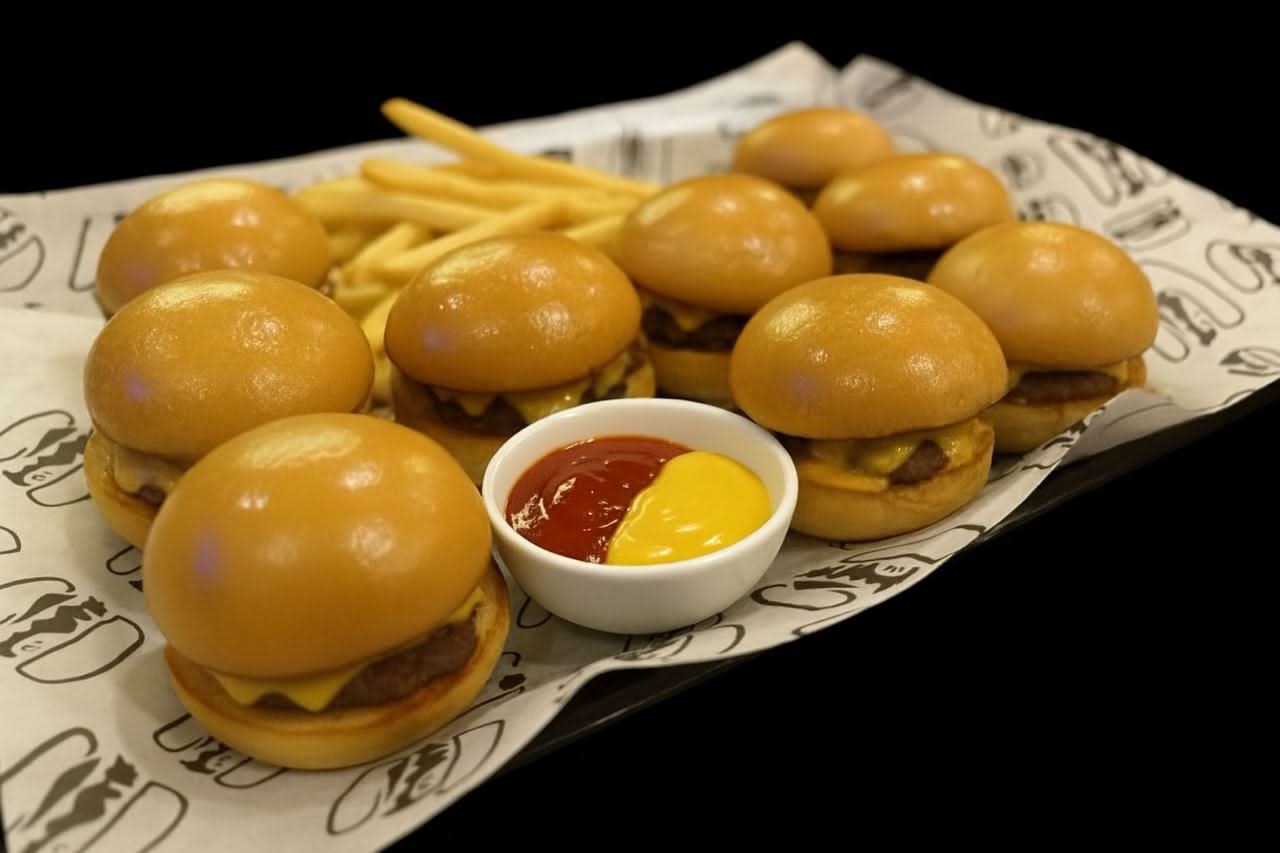 8 mini hamburguesas de res 60 g en pan brioche con queso amarillo fundido. Incluye papas fritas 200 g con pollo 120 g bañadas en queso fundido y salsa ketchup. Acompañamiento: 4 pepinillos, 4 nachos, 1 chile güero por hamburguesa. Incluye 2 cátsup y 1 mostaza.