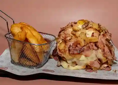Hamburguesa con carne de res 200 g, lechuga, jitomate, cebolla, piña y jamón.