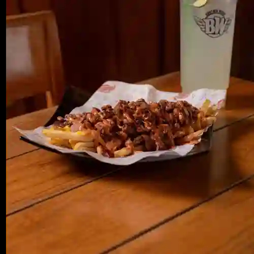 Papas fritas con queso amarillo, aderezo de la casa cebolla guisada y arrachera.