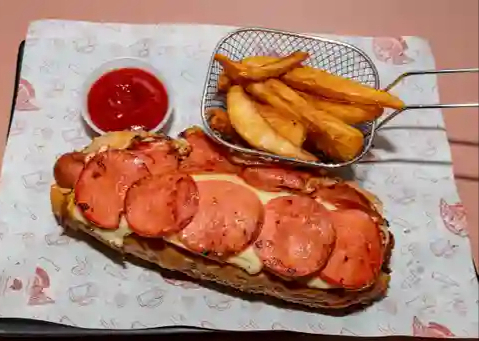 Hot dog tradicional con salchicha envuelta en tocino y pepperoni.