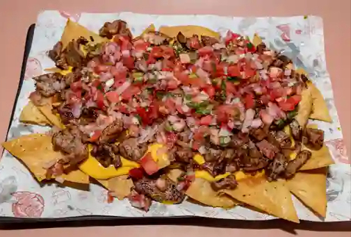 Orden de nachos 250 g con salsa de queso, jalapeño y arrachera.