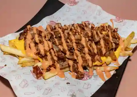 Papas francesa, 100 g de camarón 100 g de arrachera marinada, queso cheddar y aderezo de la casa.