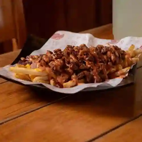 Papas fritas con queso amarillo, aderezo de la casa y cebolla guisada.
