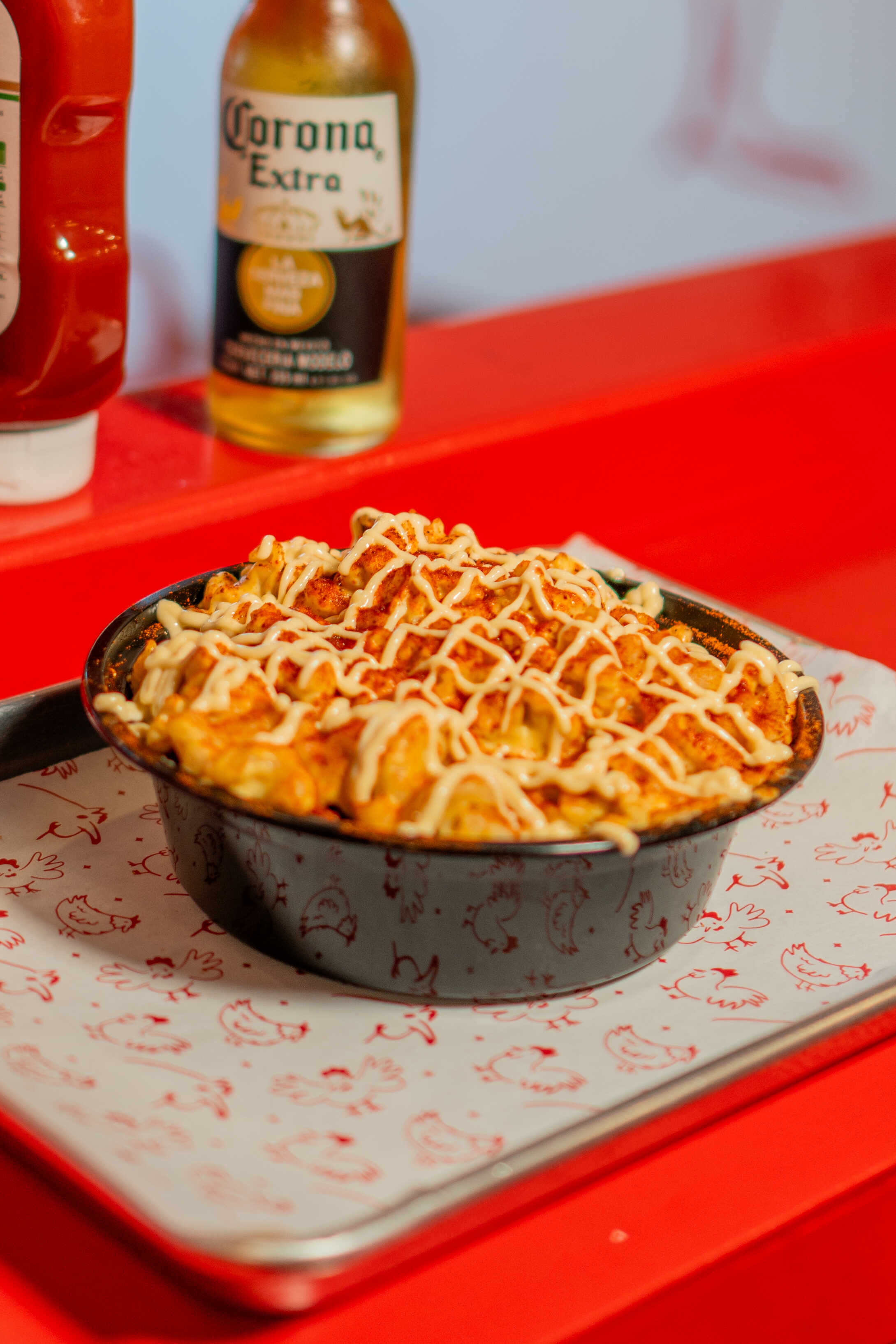 Bowl con base de papas a la francesa, 1 pechuga de pollo cortado, mac and cheese y la salsa de la casa.