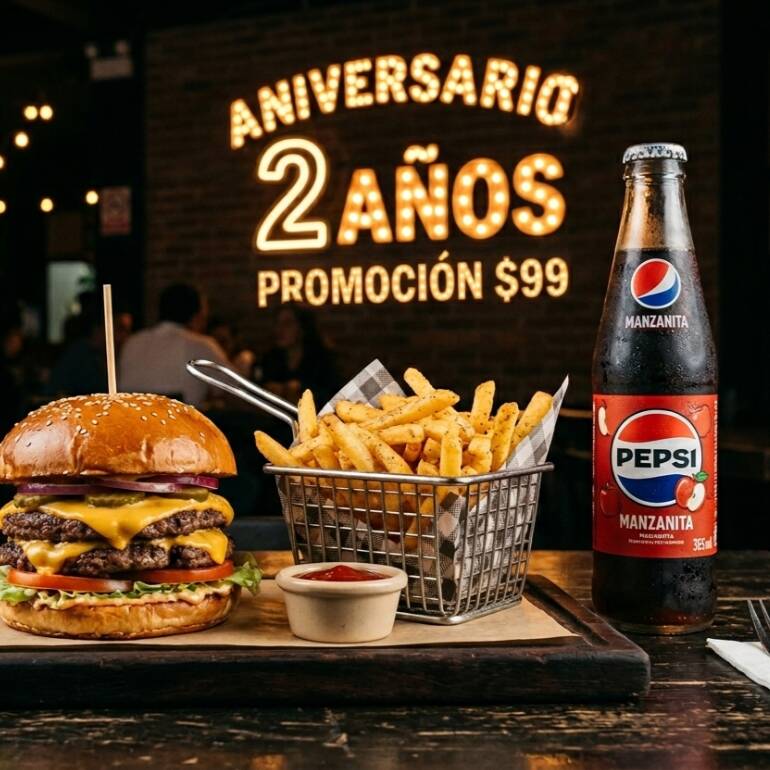 120 gr de carne, queso amarillo, lechuga, jitomate, cebolla, pepinillos, jalapeño, jitomate, cebolla, pepinillos, catsup, crema y mostaza+ 100gr papas y refresco 355ml (sabor a disponibilidad)