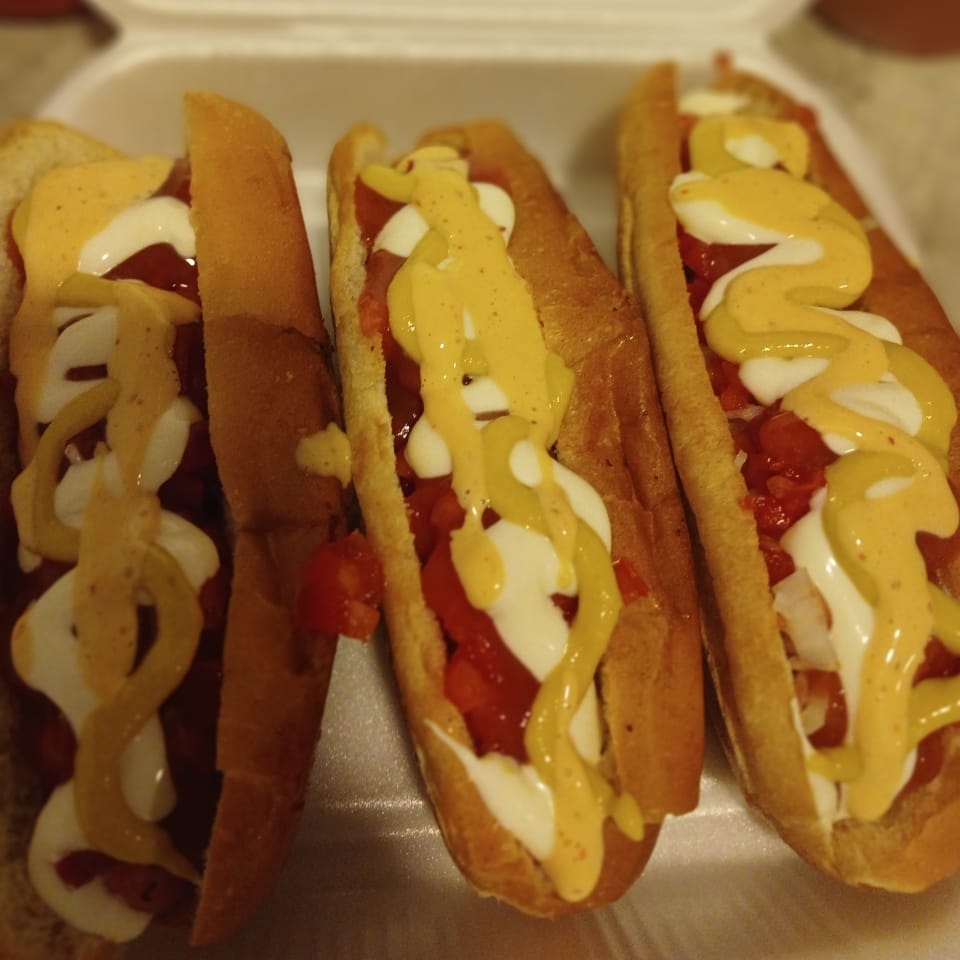 3 Hot-dog's clásicos con jitomate, cebolla, catsup, crema y mostaza.