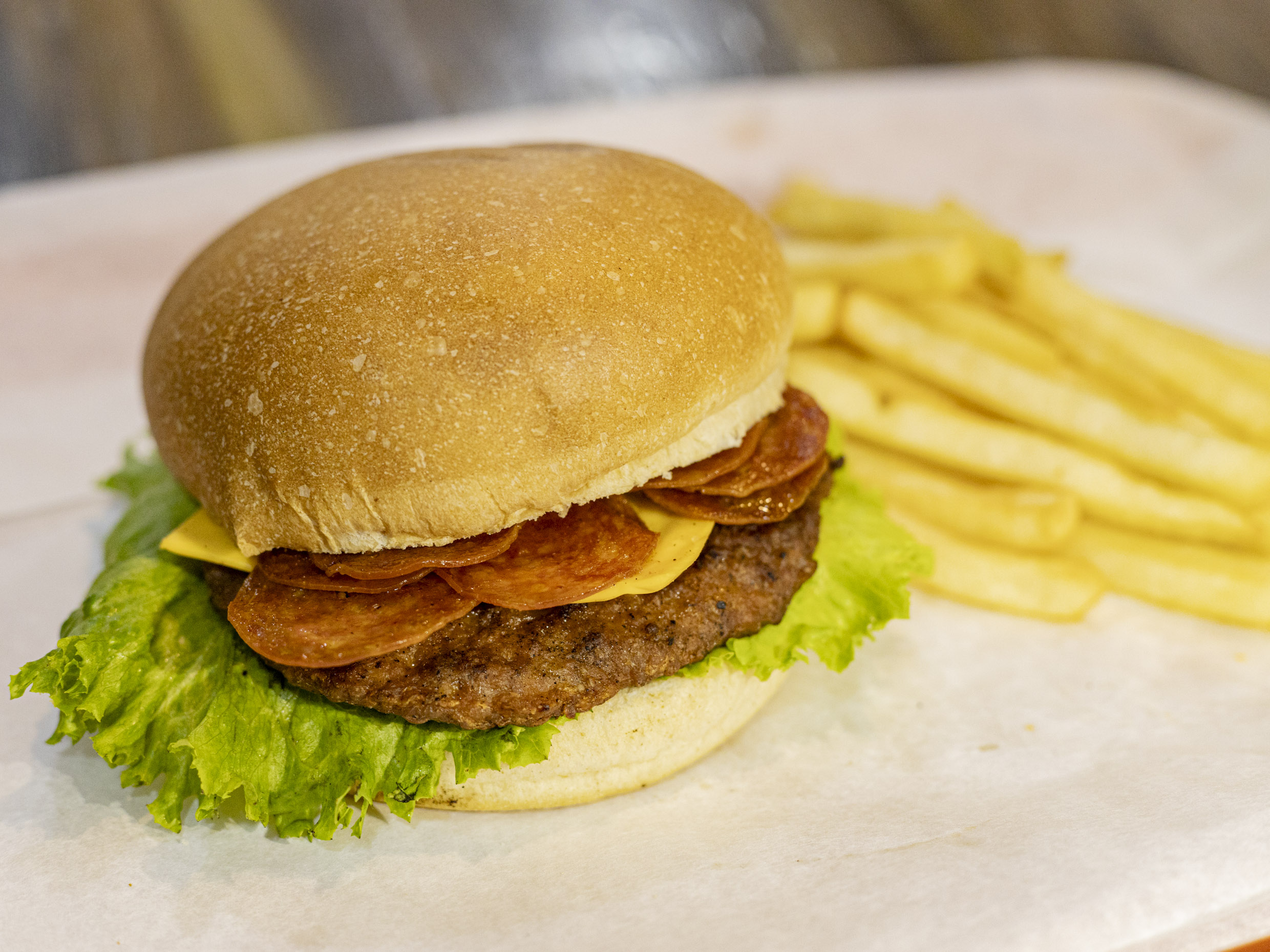 Carne hecha al carbón, queso amarillo, peperoni, salsa italiana y papas a la francesa