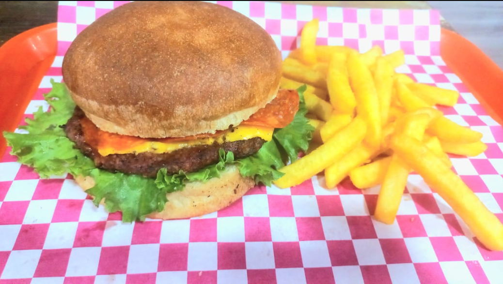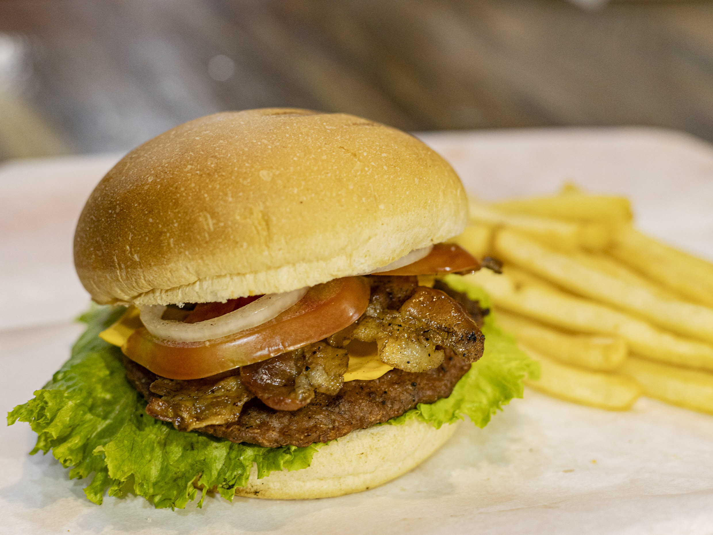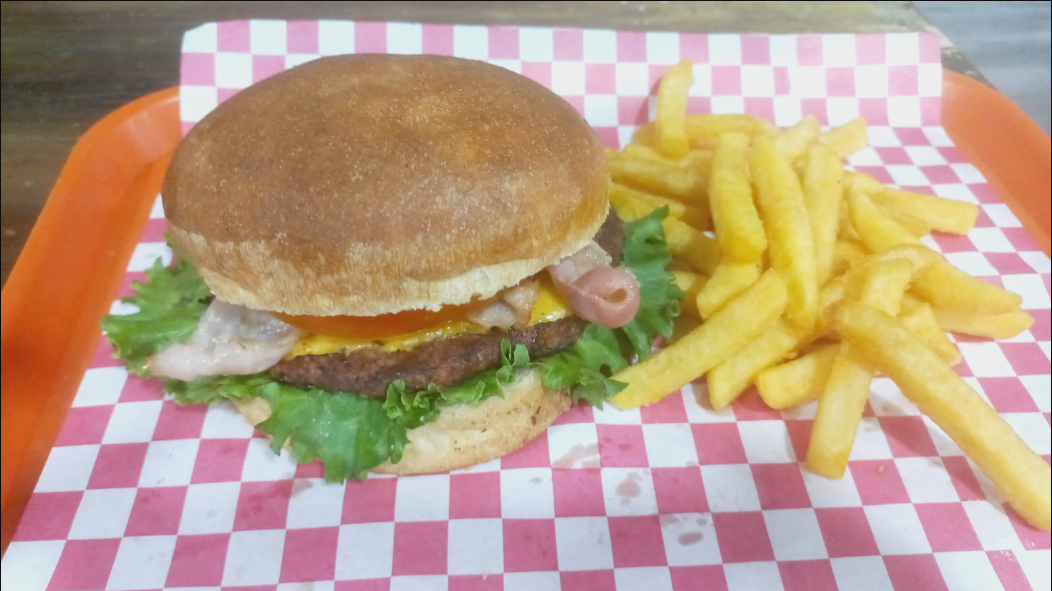 Carne hecha al carbón, queso amarillo, tocino y papas a la francesa