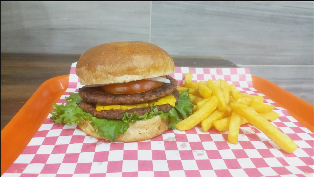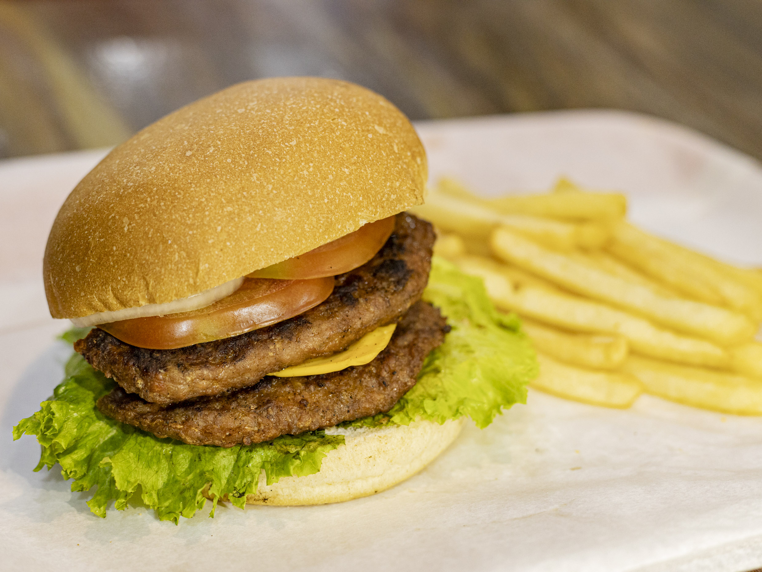 2 carnes hechas al carbón, queso amarillo y papas a la francesa