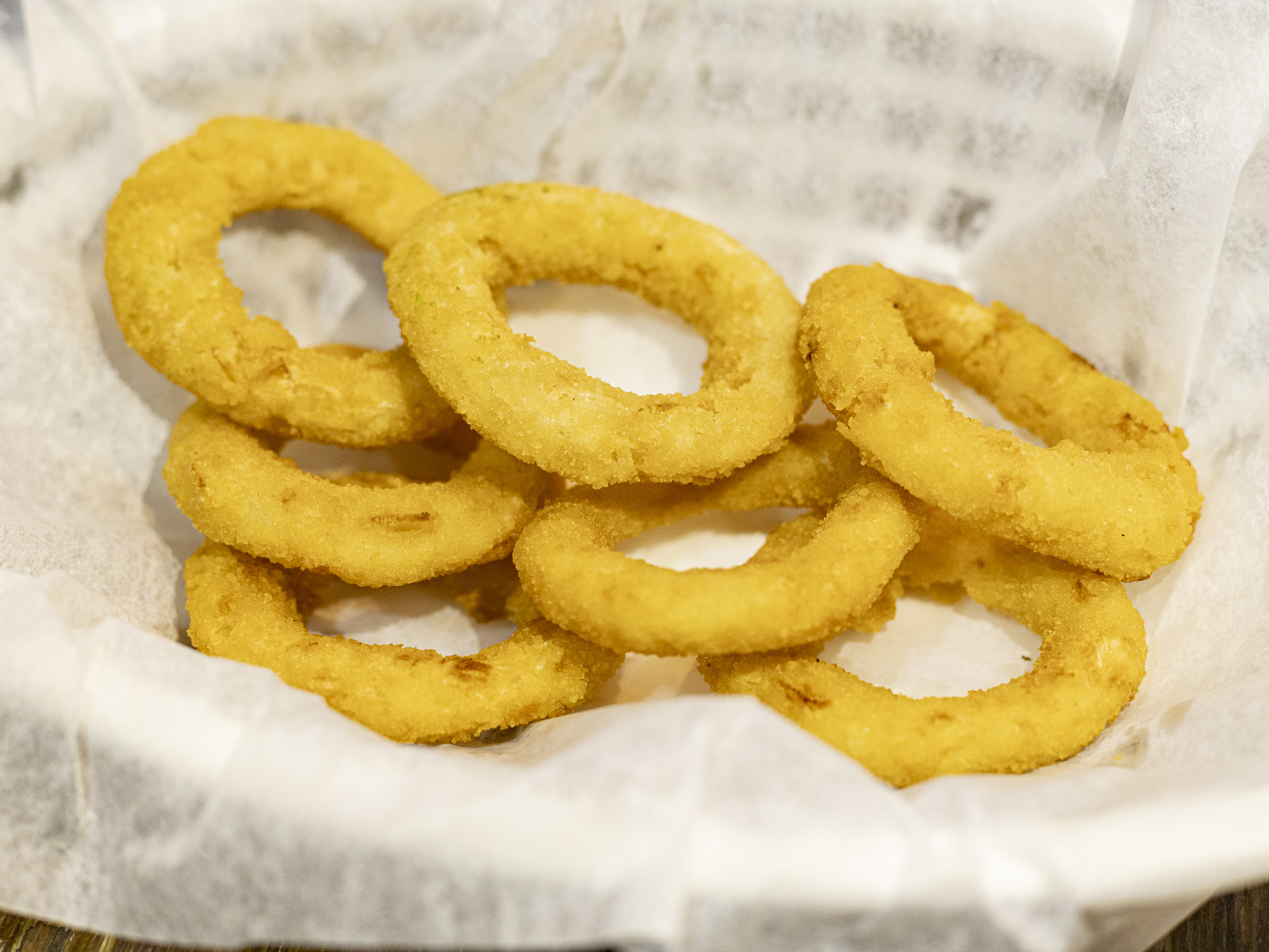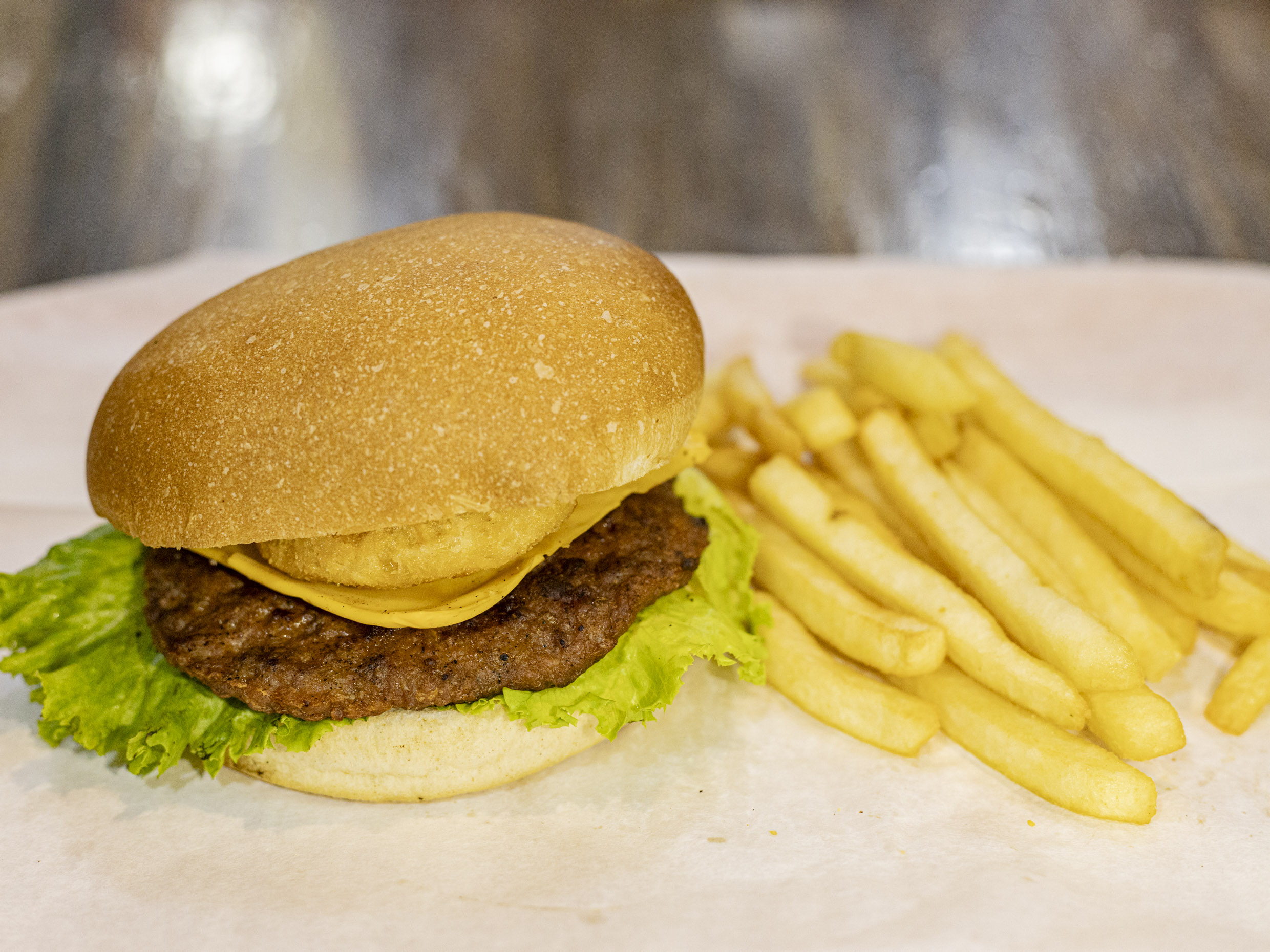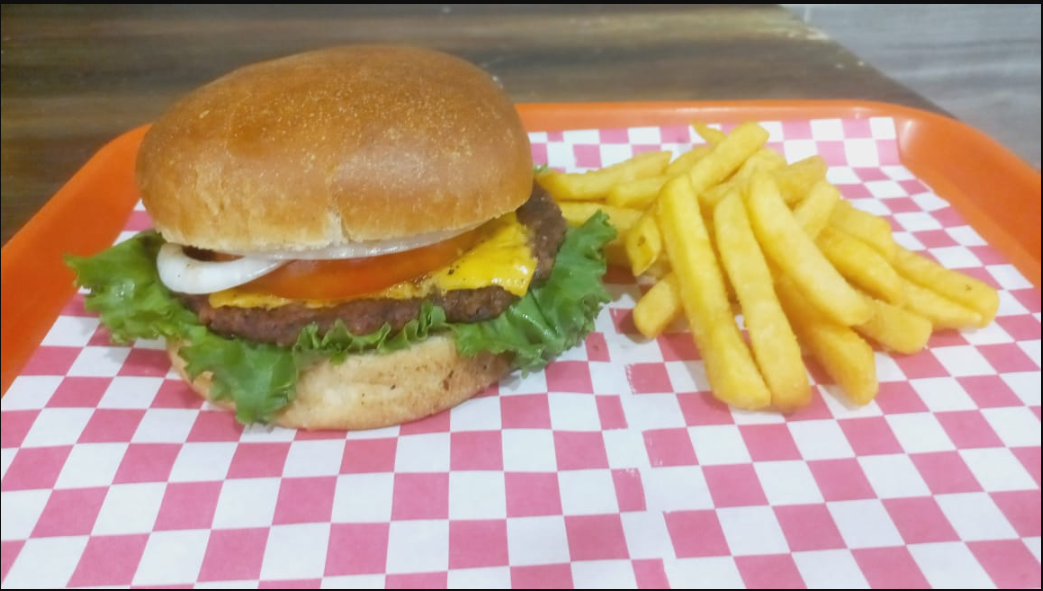 Carne hecha al carbón, queso amarillo, aro de cebolla, sal sa Bbq y papas a la francesa