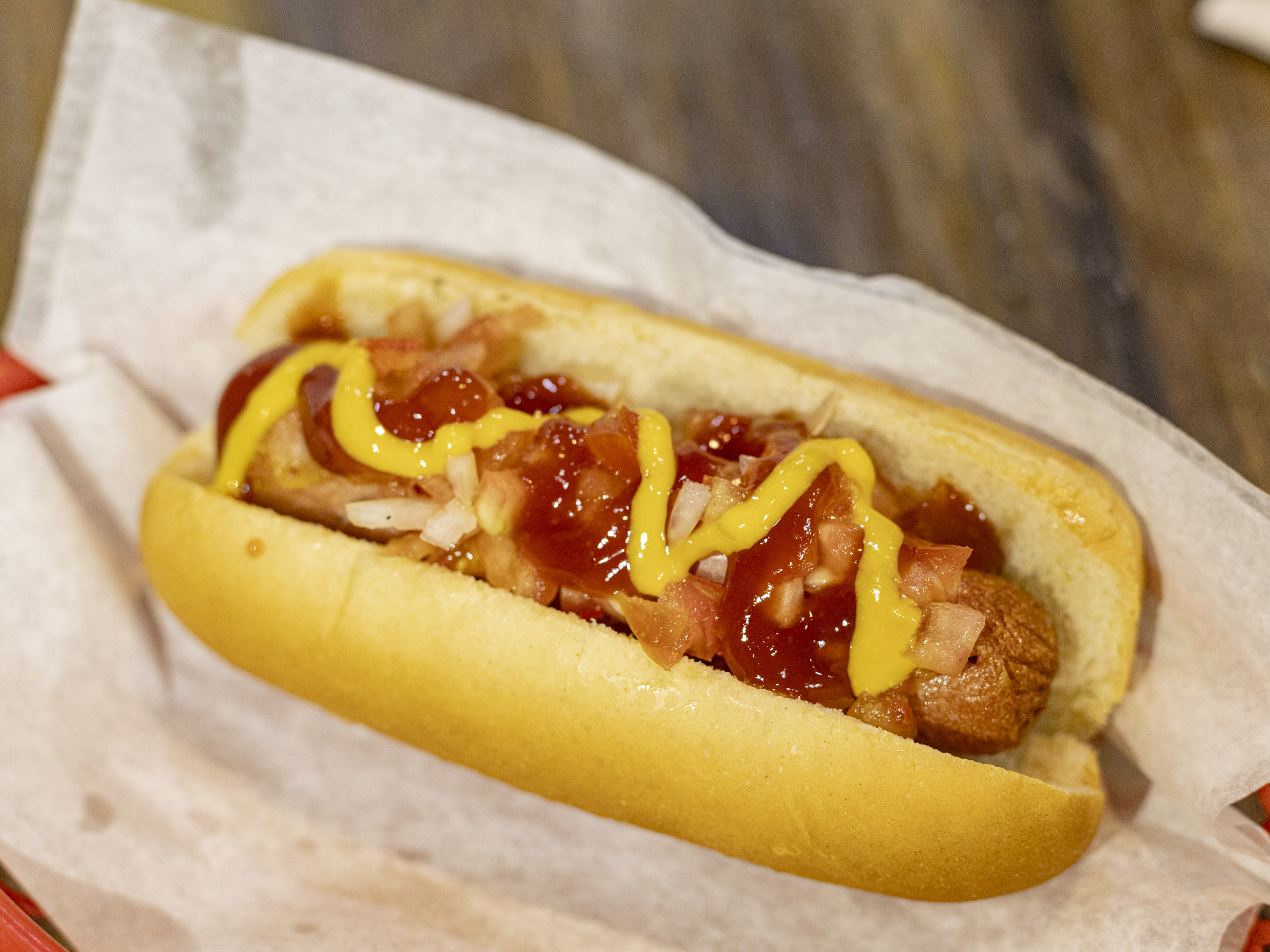 Salchicha con tocino asada al carbón con jitomate, cebolla catsup y mostaza