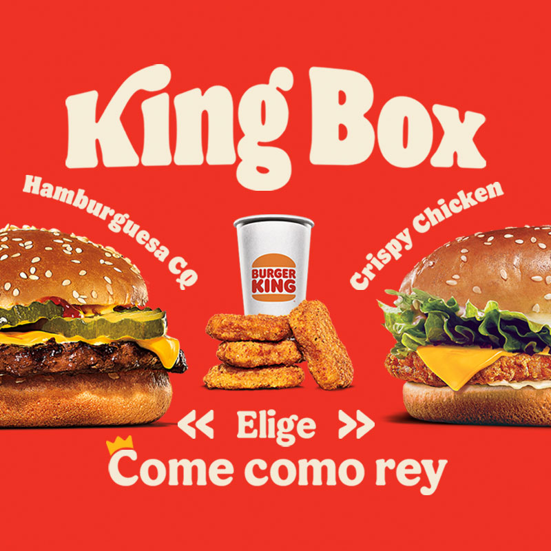 El antojo que todo Rey necesita. Elige entre hamburguesa con queso o 6 nuggets + papas chicas. (760 cal., 368 gr.)