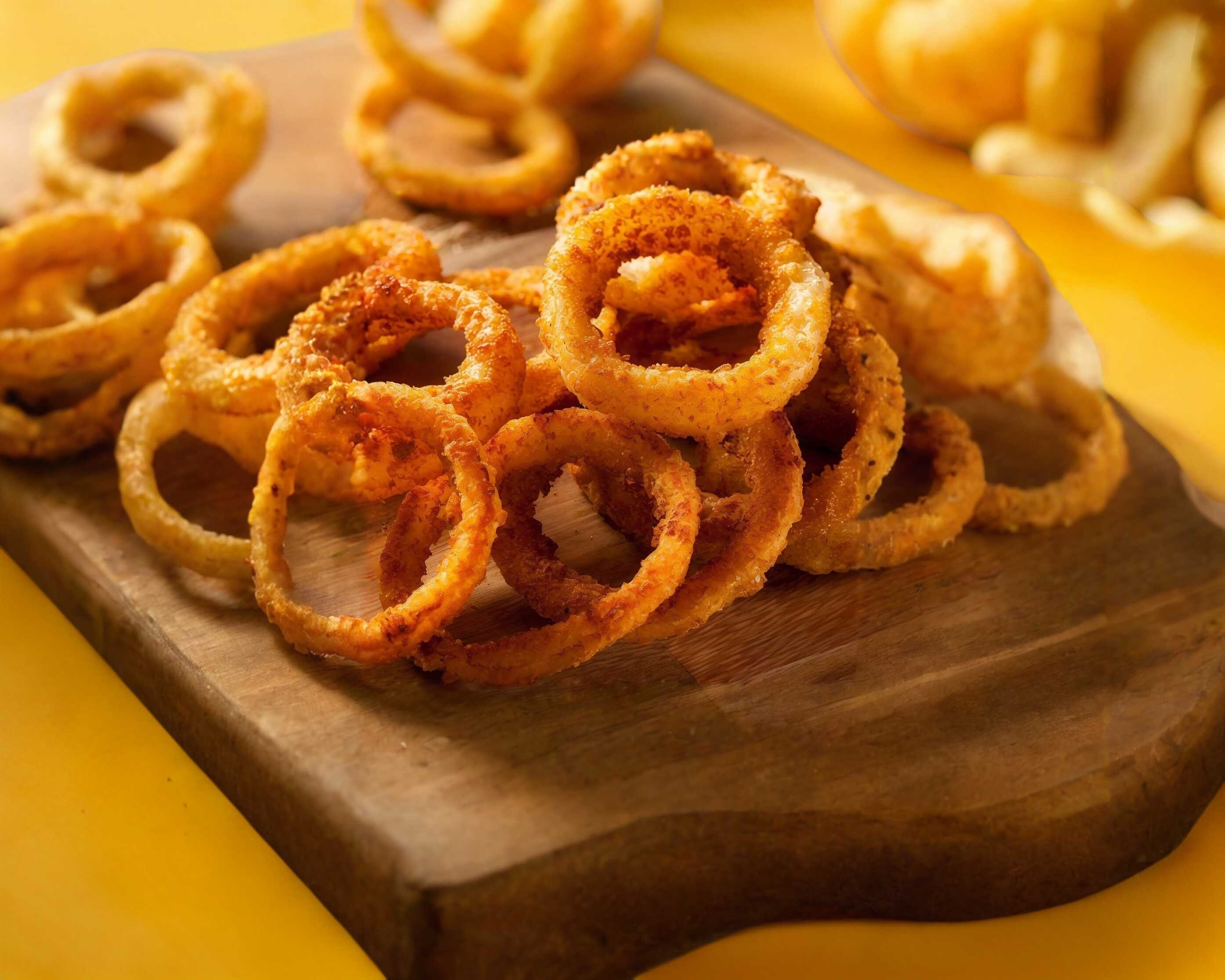 Deliciosos aros de cebolla para complementar tu exquisita hamburguesa 7 piezas, (porción personal).