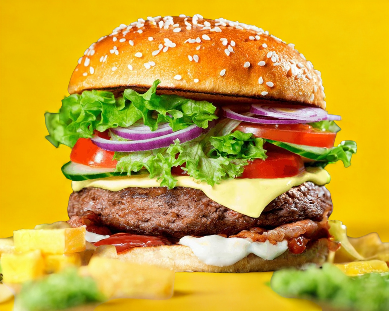 Deliciosa hamburguesa jugosa con queso amarillo, lechuga, jitomate, cebolla con un aderezo secreto de la casa, incluye una pequeña porción de papas gratis.