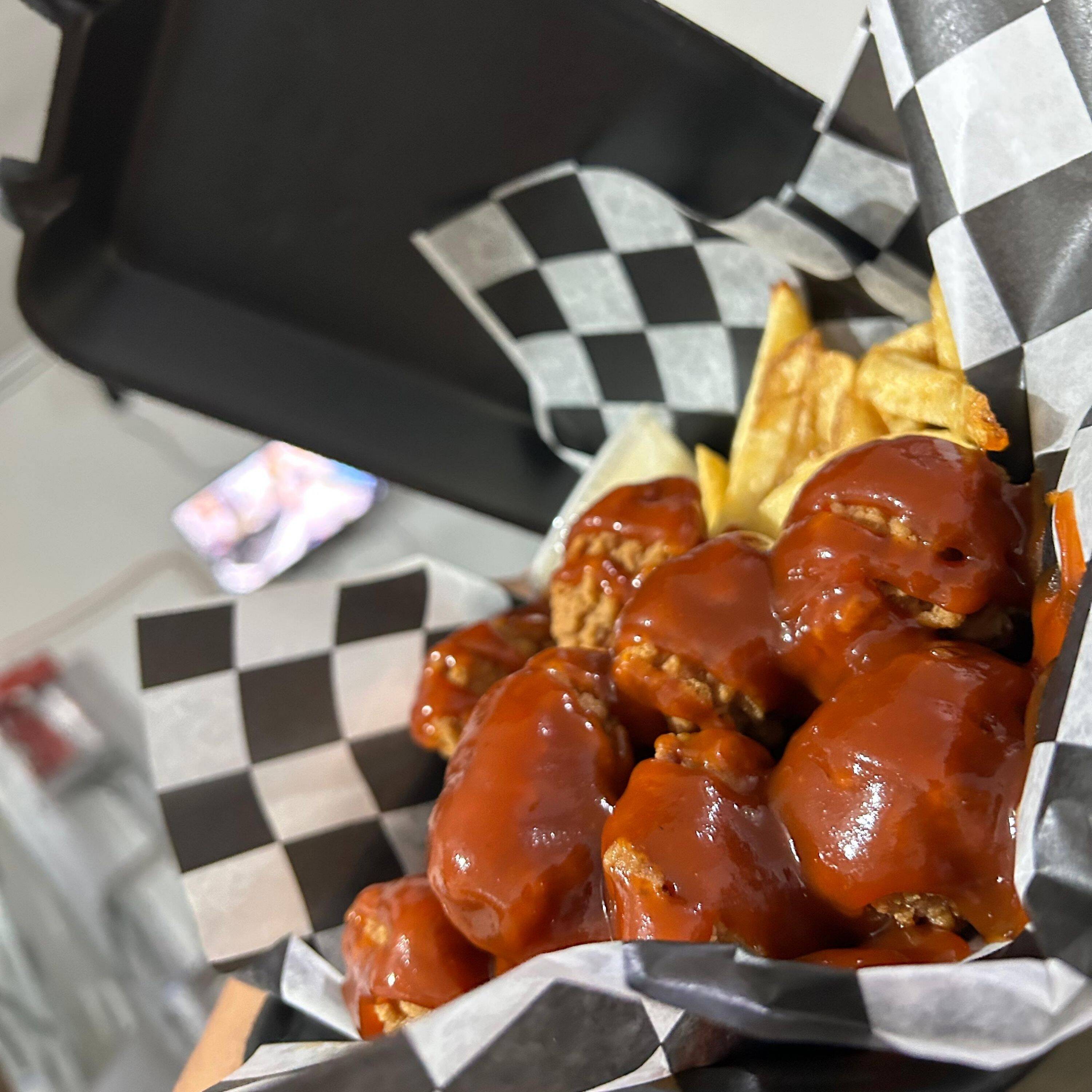 Deliciosos BONELESS de pechuga de pollo, bañados de tu salsa BBQ, acompañados con papas a la francesa