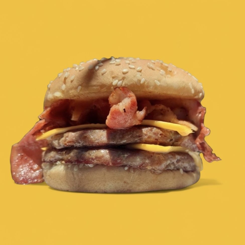 Hamburguesa DOBLE CARNE Deliciosas carnes hechas por nosotros, Queso amarillo, tiras de tocino, jitomate, cebolla, lechuga, catsup, crema y mostaza" Acompañada de papas a al francesa.