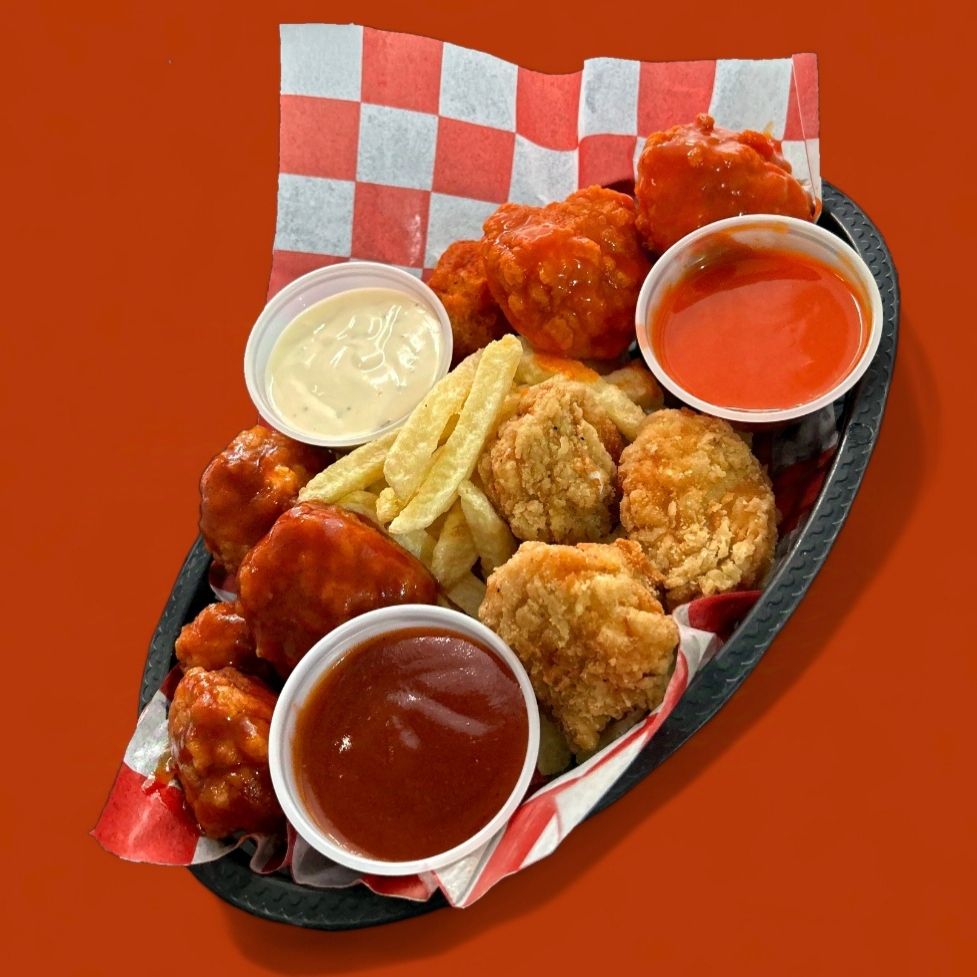 Boneless de pollo bañados en salsa bufalo, lechuga, jitomate, cebolla, queso amarillo, tiras de tocino, acompañada de papas a la francesa.