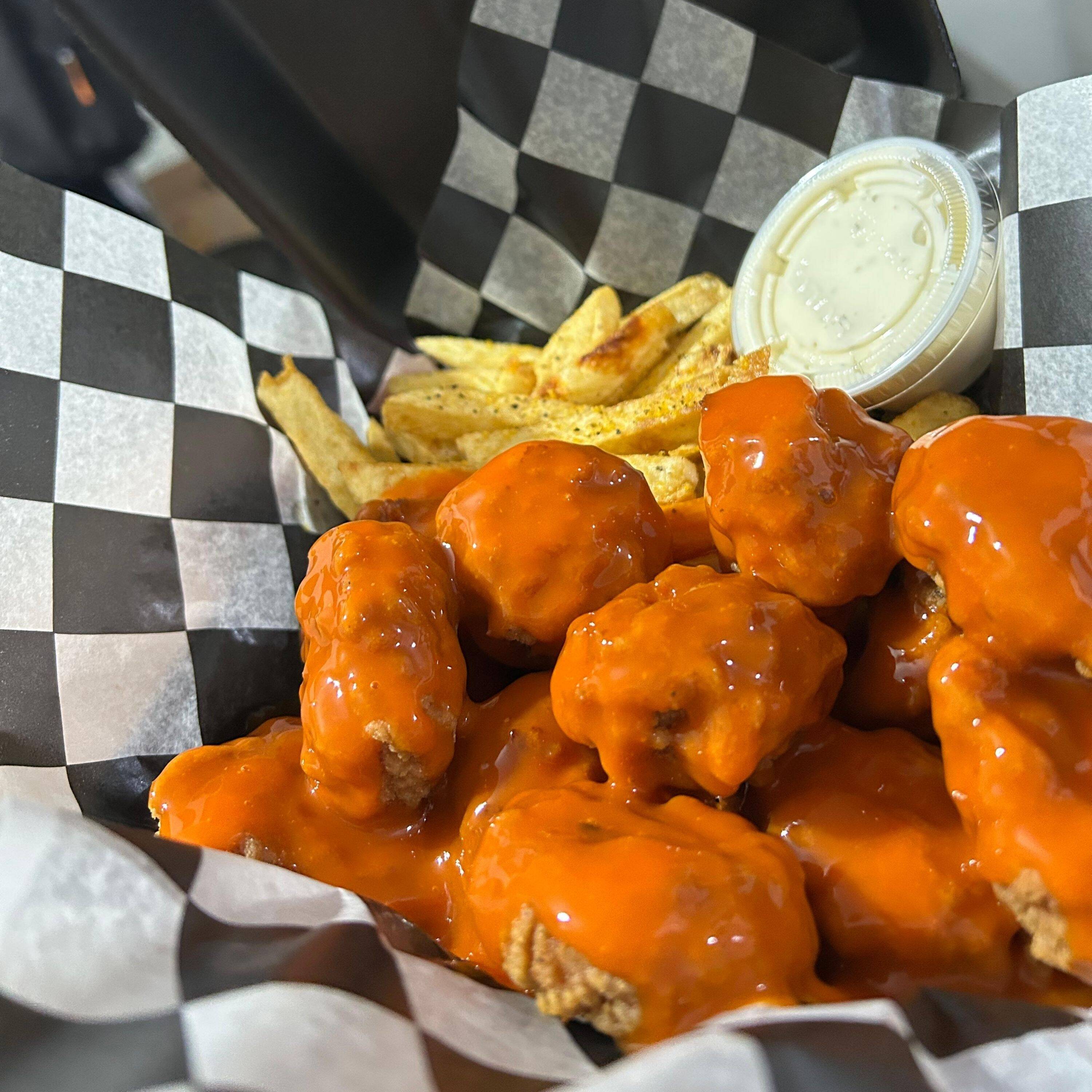Deliciosos BONELESS de pechuga de pollo, bañados de tu salsa BUFALO, acompañados con papas a la francesa