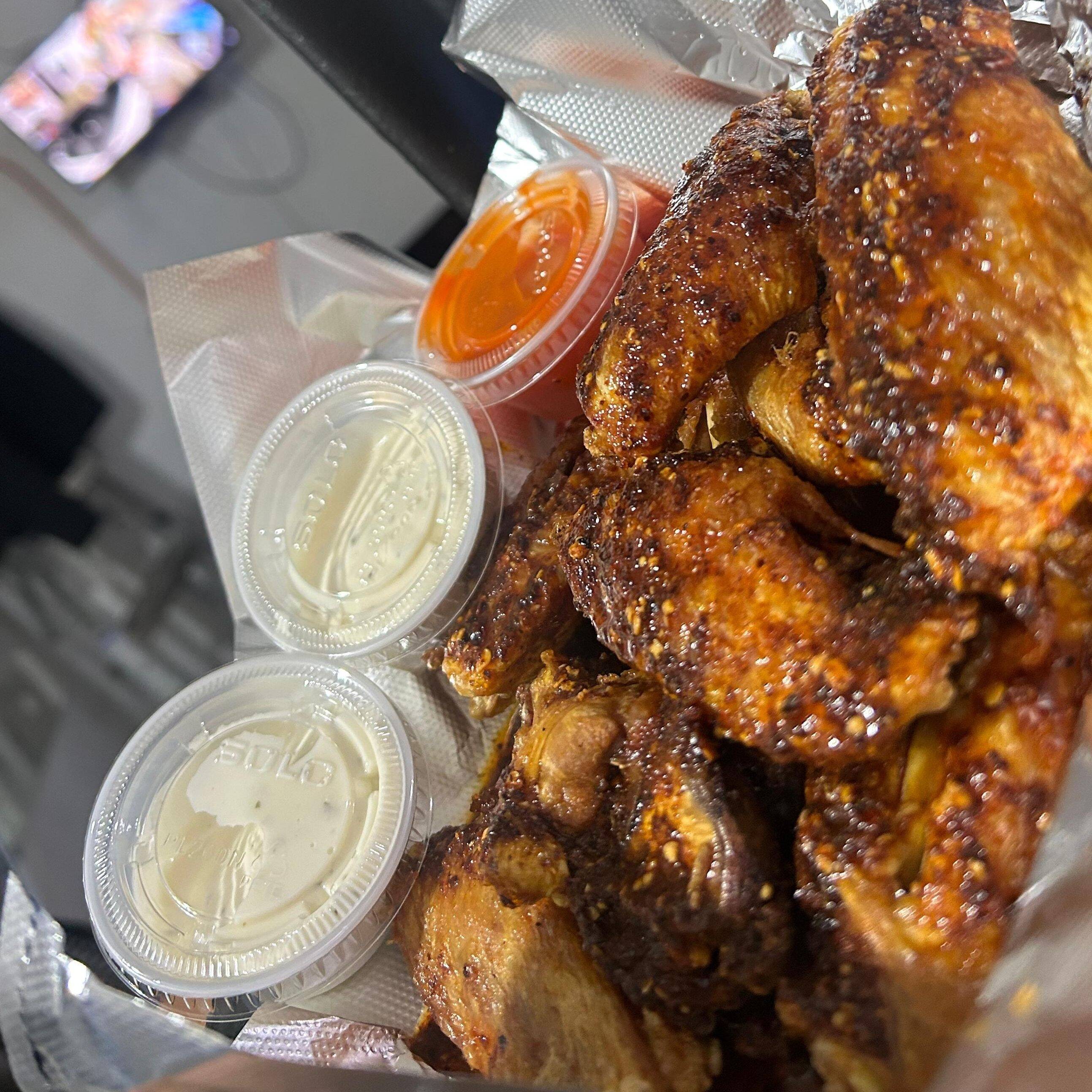 Alitas de pollo bañadas en salsa de tu preferencia acompañadas de papas a la francesa y aderezo ranch