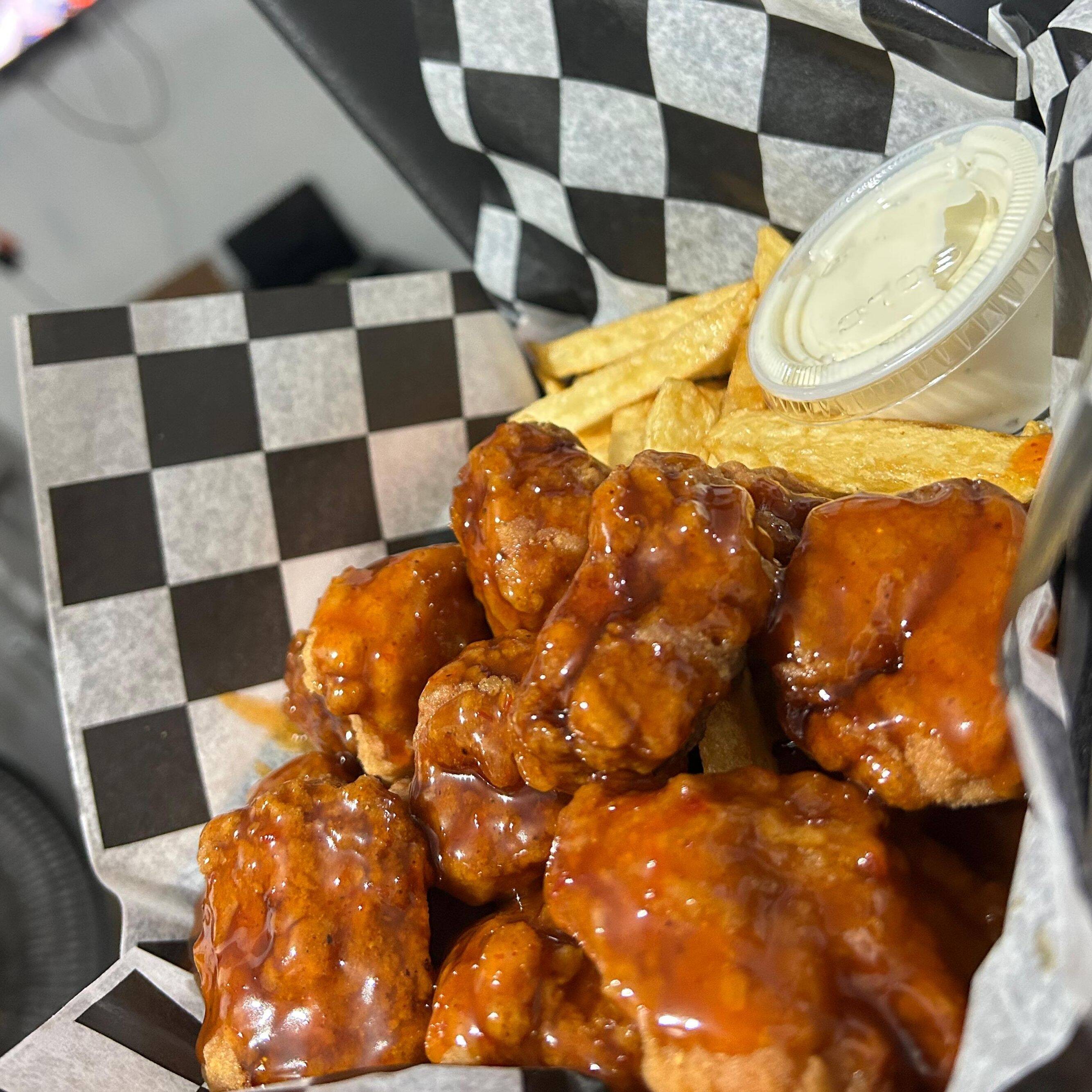 Deliciosos BONELESS de pechuga de pollo, bañados de tu salsa favorita, acompañados con papas a la francesa