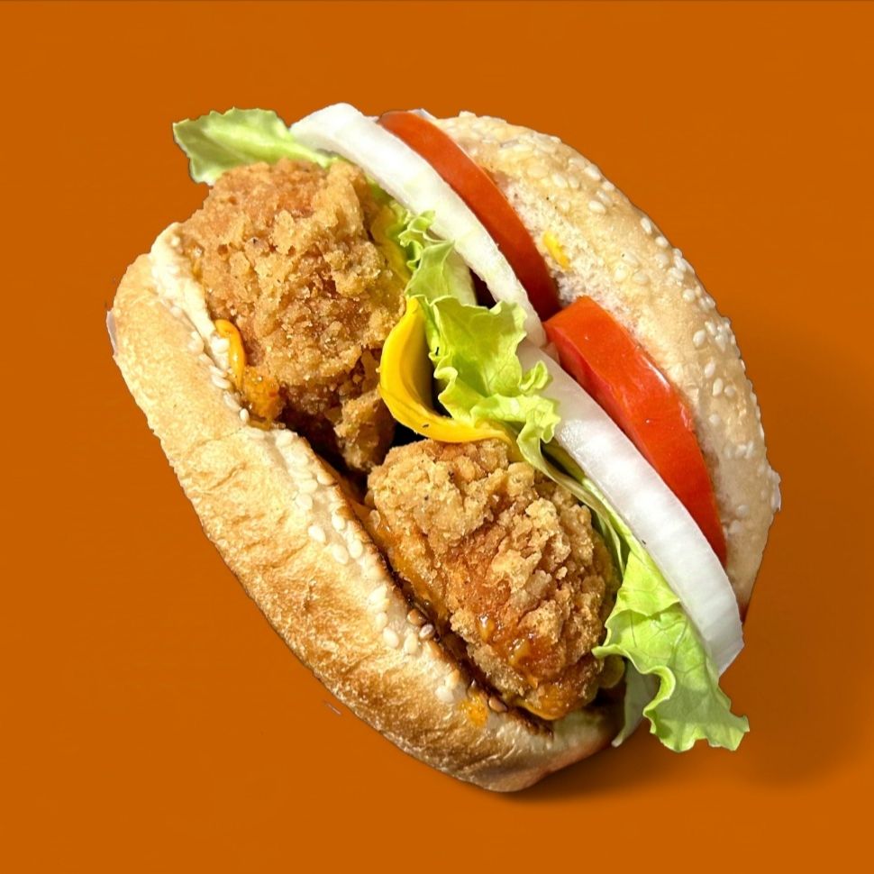 Hamburguesa BONELESS' Doraditos Boneless de pechuga, Queso amarillo, jitomate, cebolla, lechuga, catsup, crema y mostaza" Acompañada de papas a al francesa.