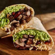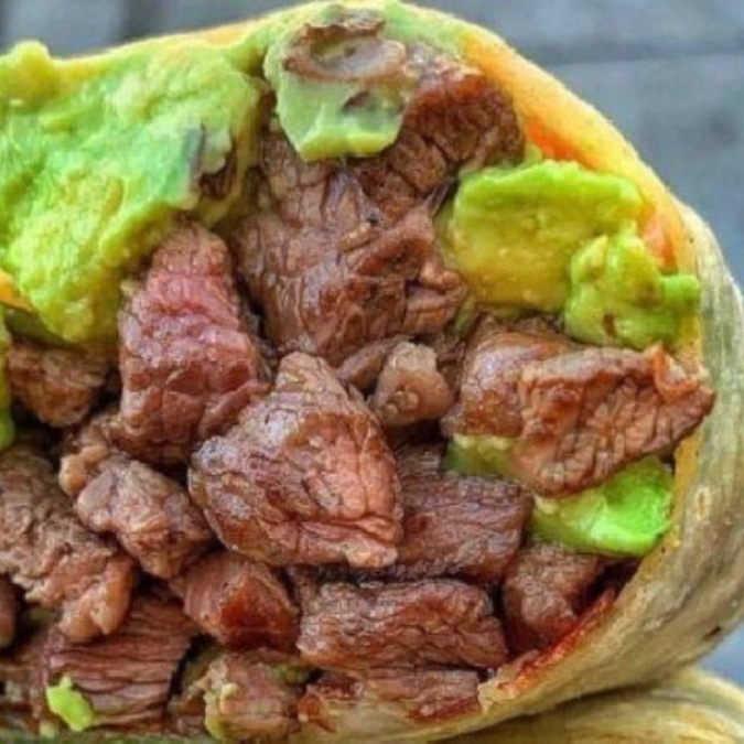 Burro Relleno con carne asada , Papas a la francesa , Guacamole , Quesho Cheddar , Queso Gouda,Frijoles Refritos.