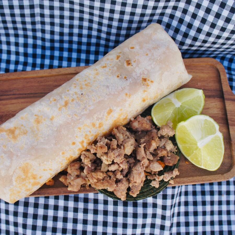 carne elegida en una tortilla de harina 30cm con frijol y arroz, salsa y limon aparte