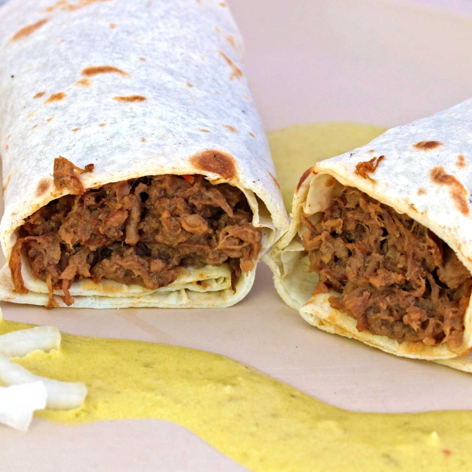 peinecillo de res burrito de tortilla de harina con frijol y arroz, limon y salsa picante aparte