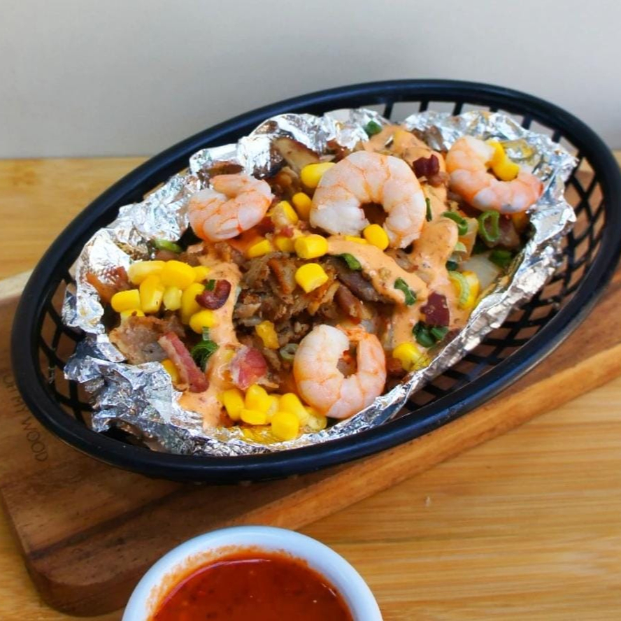 bistec y camaron en trozos de papa con queso fundido y chipotle, totopos y picante aparte