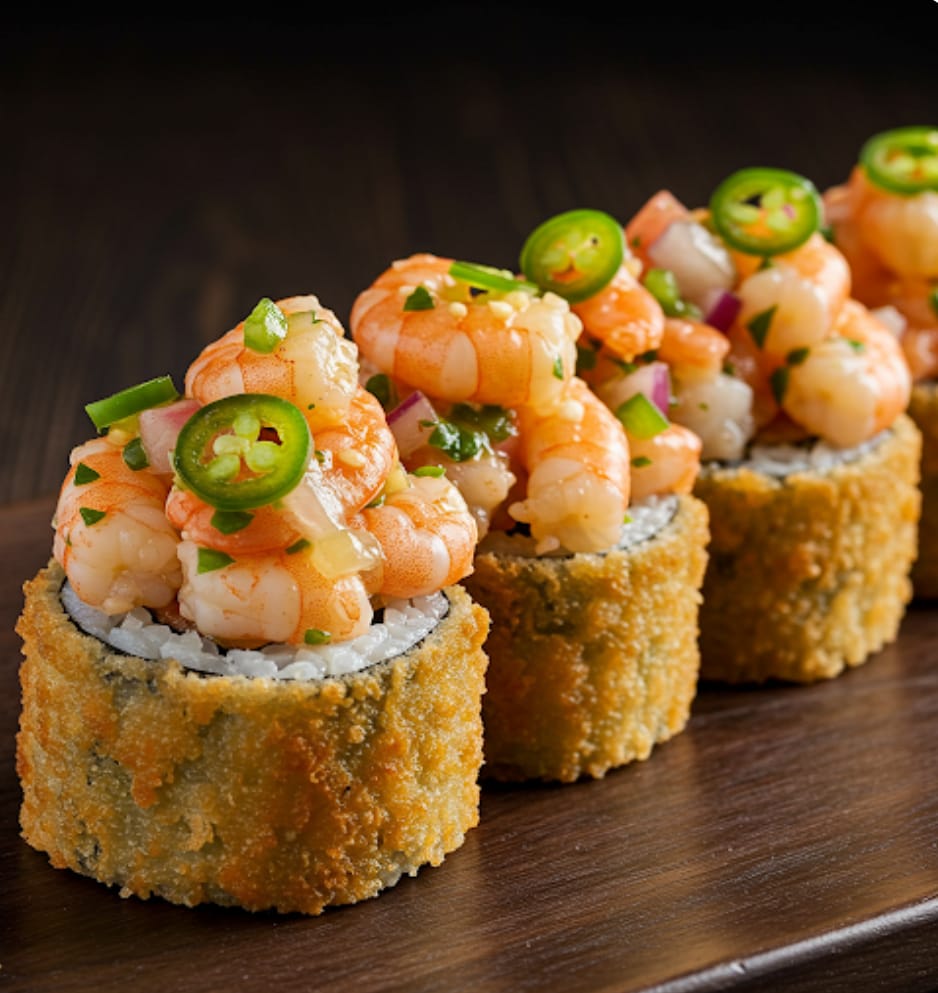 Rollo empanizado con topping de camarón, aguachile en la parte de arriba, al centro, queso crema, alga marina, pepino y aguacate.